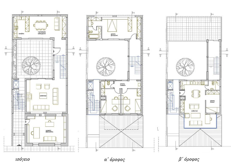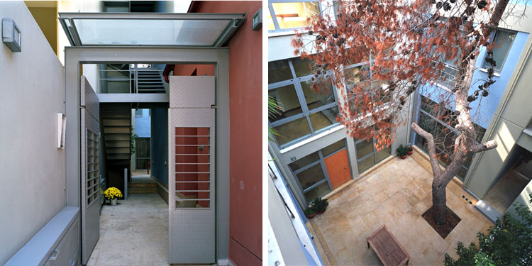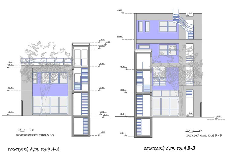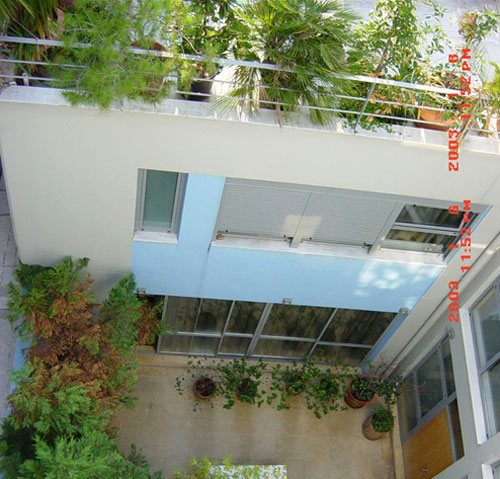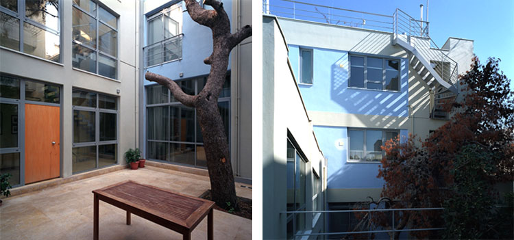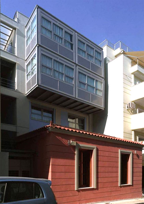 Η διατηρητέα κατοικία επισκευάζεται και εντάσσεται στο νέο κτιριακό σύνολο μιας κατοικίας που οργανώνεται σε τρεις στάθμες: ισόγειο, α όροφος, β όροφος με εσωτερική αυλή. Το ισόγειο και τον πρώτο όροφο καταλαμβάνει μία κατοικία με κοινόχρηστους και ατομικούς χώρους γονέων και παιδιών. Στο ισόγειο τοποθετείται το γραφείο με εξωτερική και εσωτερική επικοινωνία. Στον β όροφο αναπτύσσεται ένα μονόχωρο διαμέρισμα.