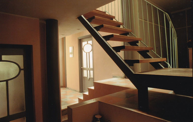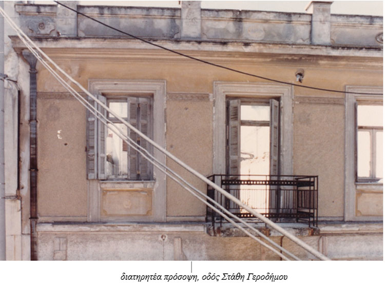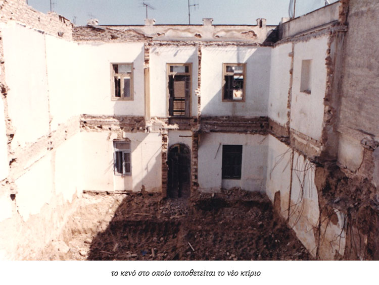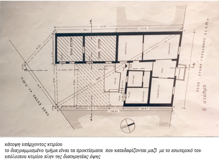 Διατηρείται η πρόσοψη, σύμφωνα με το σχετικό διάταγμα και το υφιστάμενο περίγραμμα μετά την αφαίρεση δύο προσκτισμάτων ώστε να δημιουργηθεί ευρύχωρη αυλή. Το εσωτερικό του κτιρίου ανακατασκευάζεται ριζικά ακολουθώντας την αρχή του αρχιτεκτονικού περίπατου. Η είσοδος γίνεται από την οδό Στάθη Γεροδήμου και οι επιμέρους χώροι αναπτύσσονται γύρω από την κίνηση που οδηγεί σ’ αυτούς, με οπτική επαφή του συνόλου από την έναρξη (είσοδος) μέχρι το τέλος του περιπάτου (γραφειακός χώρος).