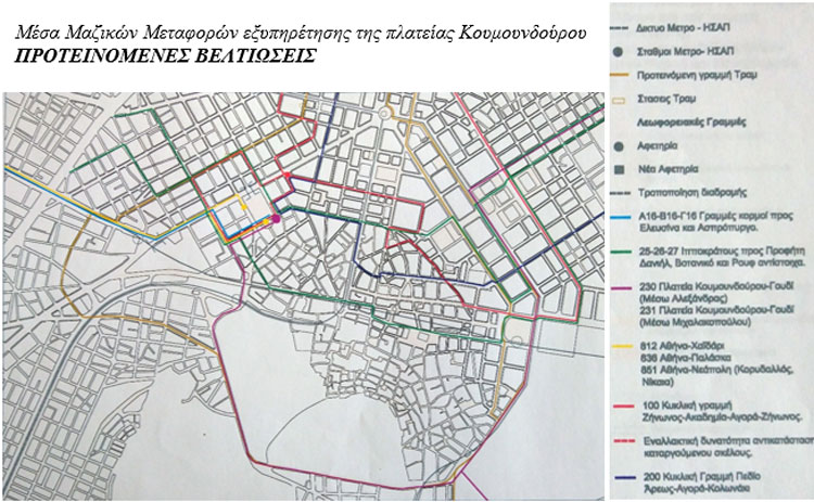Εντάσσουμε την πλατεία Κουμουνδούρου στο κυκλοφοριακό δίκτυο και τα οικοδομικά τετράγωνα που την περιβάλλουν, προτείνοντας ορισμένες αλλαγές που εξυπηρετούν την προσβασιμότητά της.